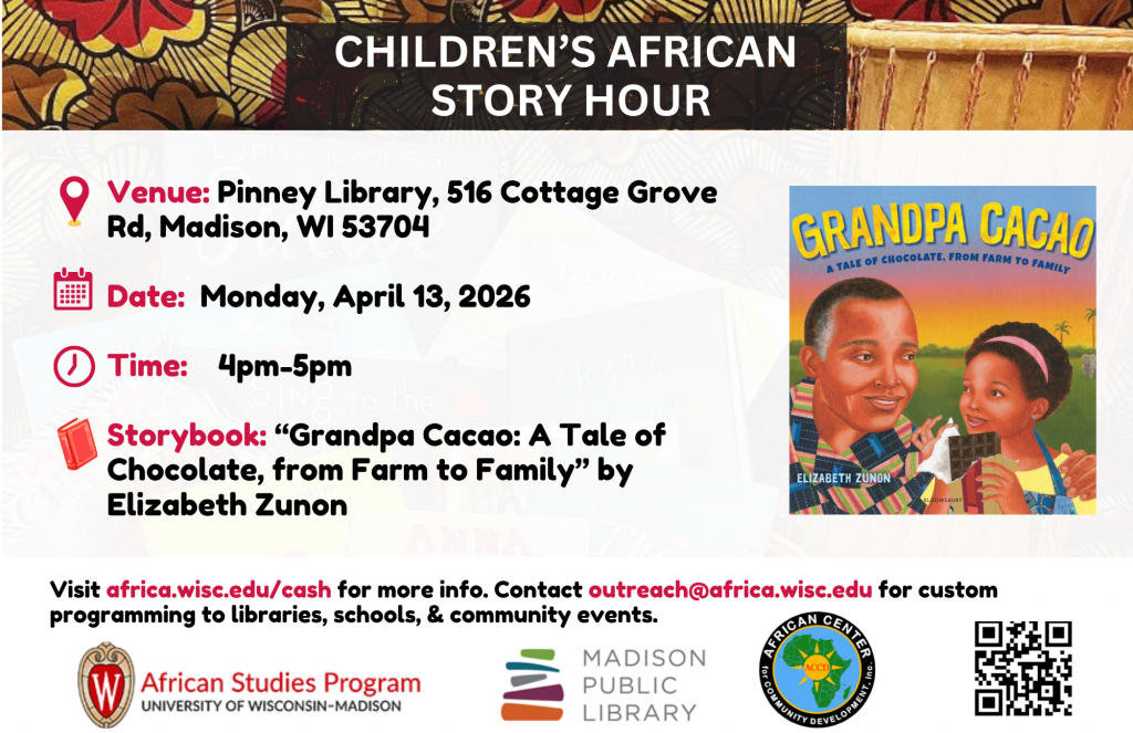 This FREE story hour is open to children of all ages and backgrounds. It is an opportunity for your children, grandchildren and little friends to learn about Africa, different cultures and diverse culinary traditions.